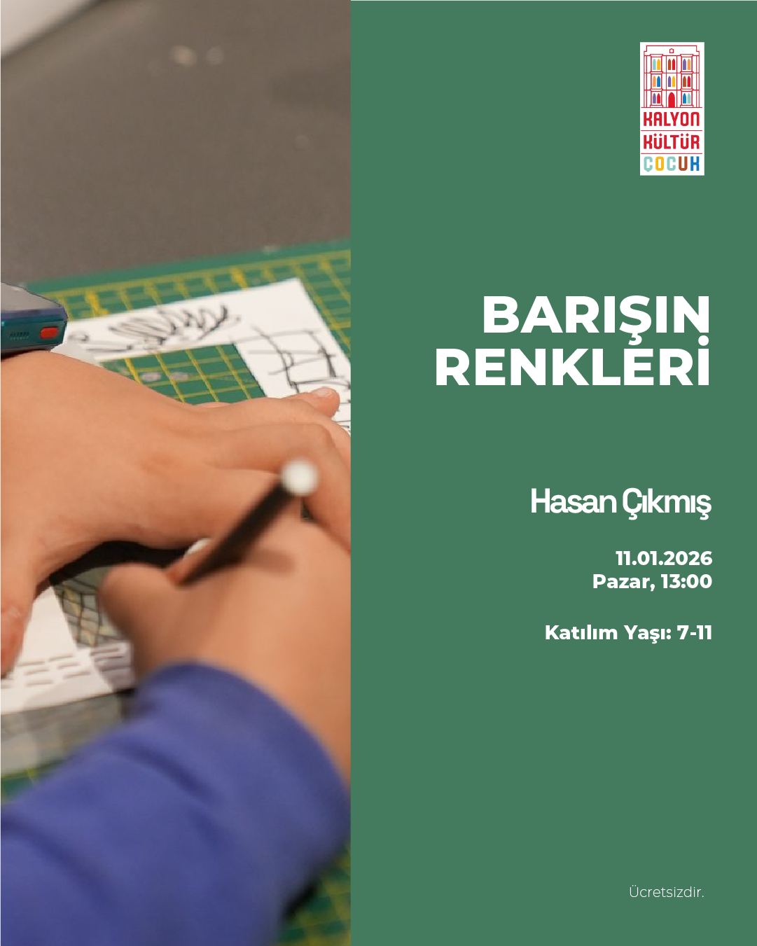 Barışı, umudu ve birlikte yaşam duygusunu renklerle ifade ediyoruz. Zeytin dalı, güvercin, güneş ve çocuk figürlerinden ilham alan bu atölyede; Filistin bayrağının renkleri sembolik, yumuşak ve duyarlı bir anlatımla ele alınacak. Sulu boya, pastel ve kolaj tekniklerinin kullanılacağı atölye, Devlet Sanatçısı Hasan Çıkmış rehberliğinde gerçekleştirilecektir.Renklerin diliyle barışı birlikte düşünmeye davetlisiniz.